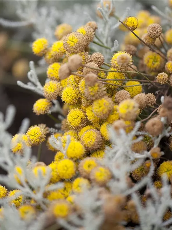 Santolina chamaecyparissus bildet ballförmige, gelbe Blüten ab Juli.