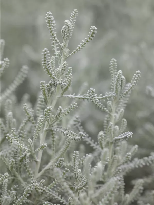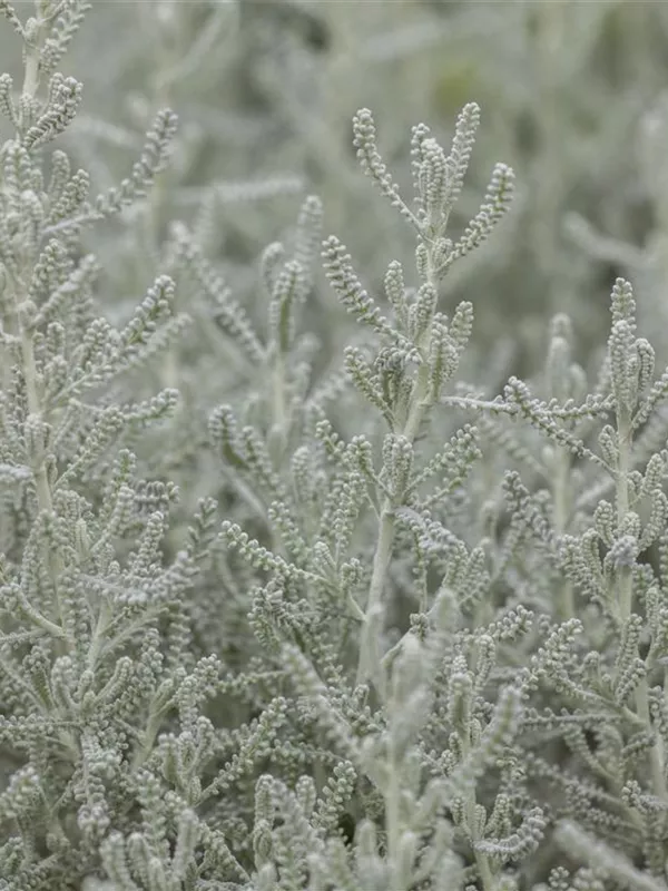 Zum Verzehr geeignet. Die wintergrünen Blätter des Grauen Heiligenkrauts sind silbergrau, gefiedert, behaart.