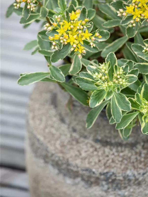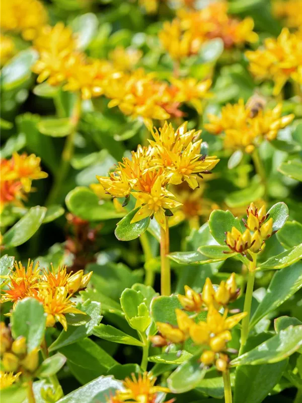 Sedum kamtschaticum bildet in Dolden angeordnete, goldgelbe Blüten ab Juli.