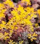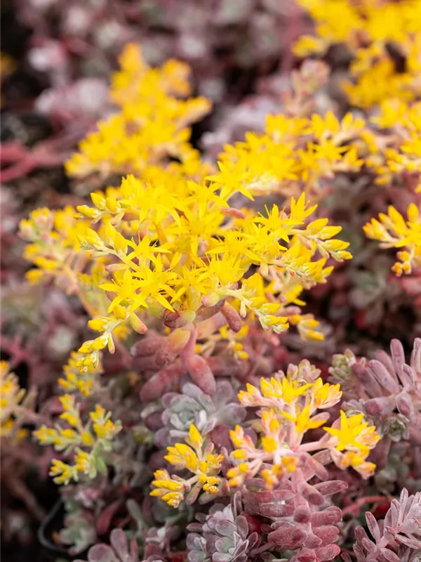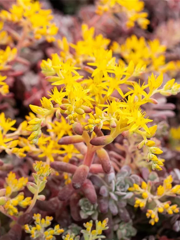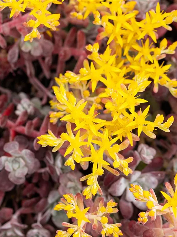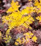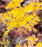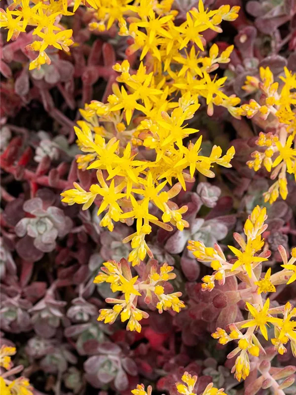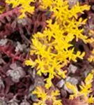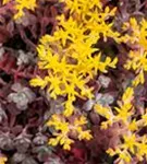 Sedum spathulifolium 'Purpureum' bildet in Dolden angeordnete, gelbe Blüten ab Mai.
