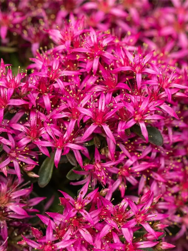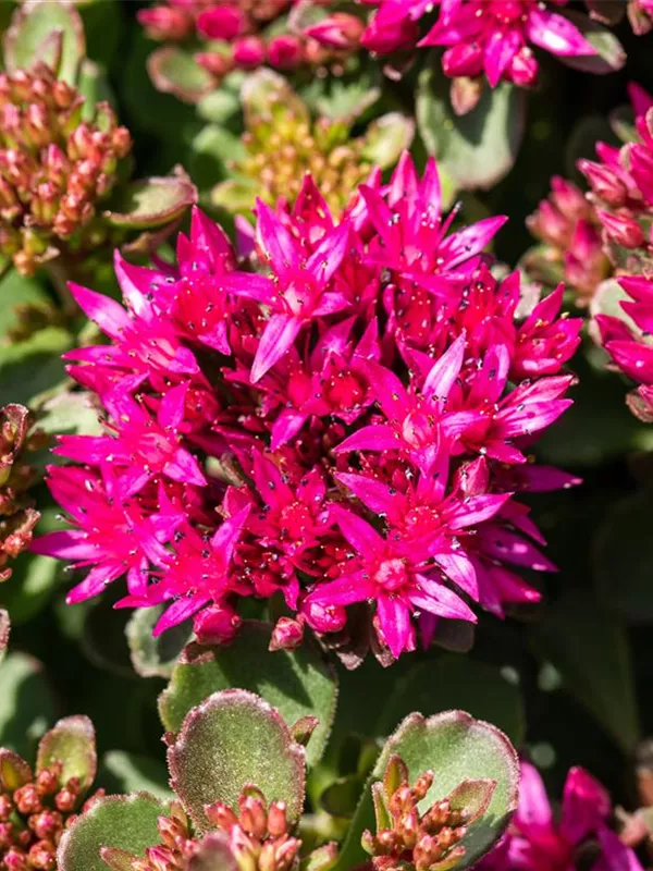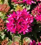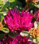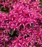 Sedum spurium bildet in Dolden angeordnete, rosafarbene Blüten ab Juni.