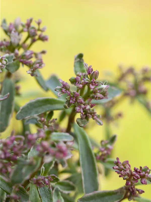 Sedum spurium 'Tricolor' bildet sternförmige, in Dolden angeordnete, rote Blüten ab Juni.