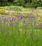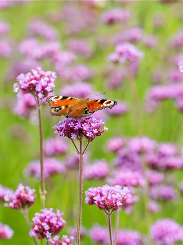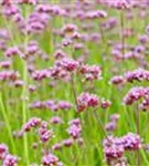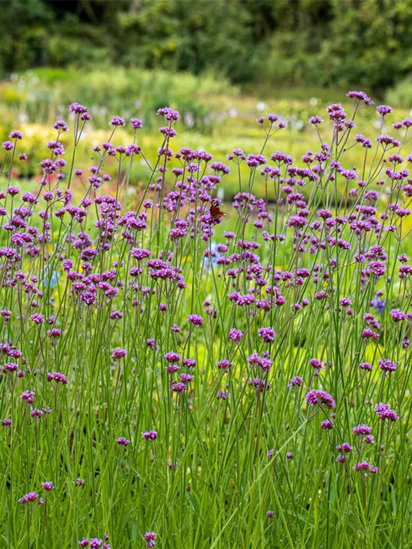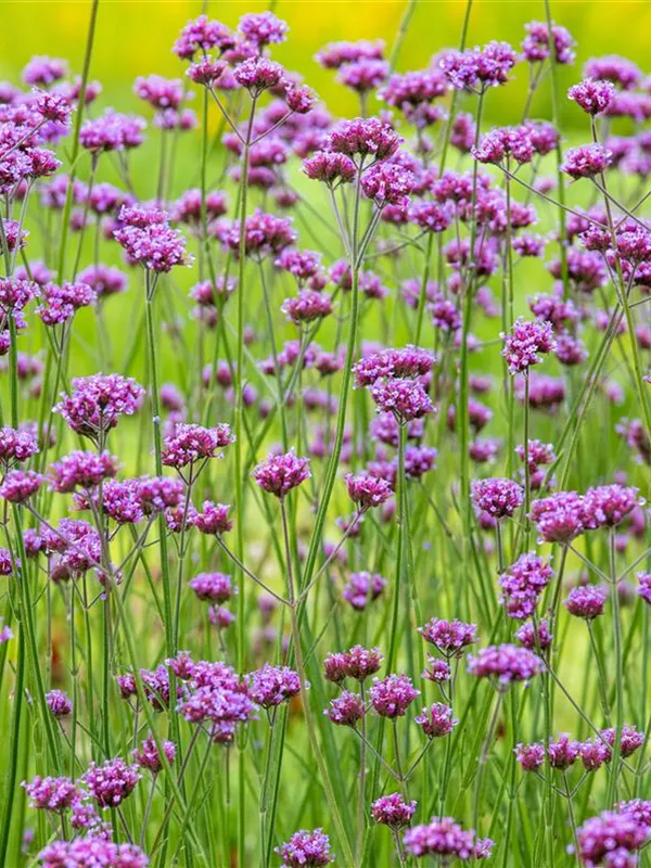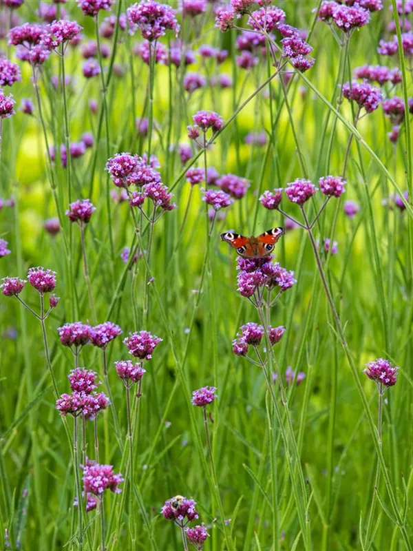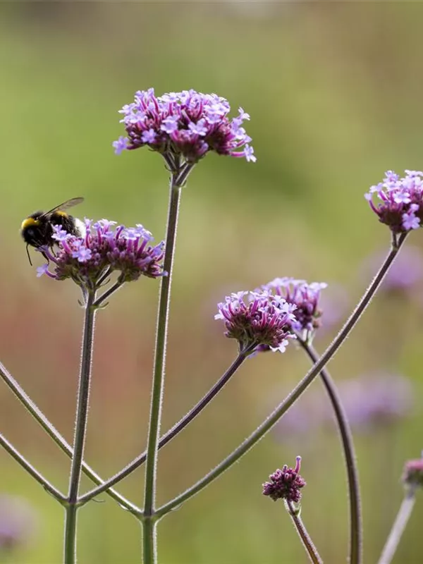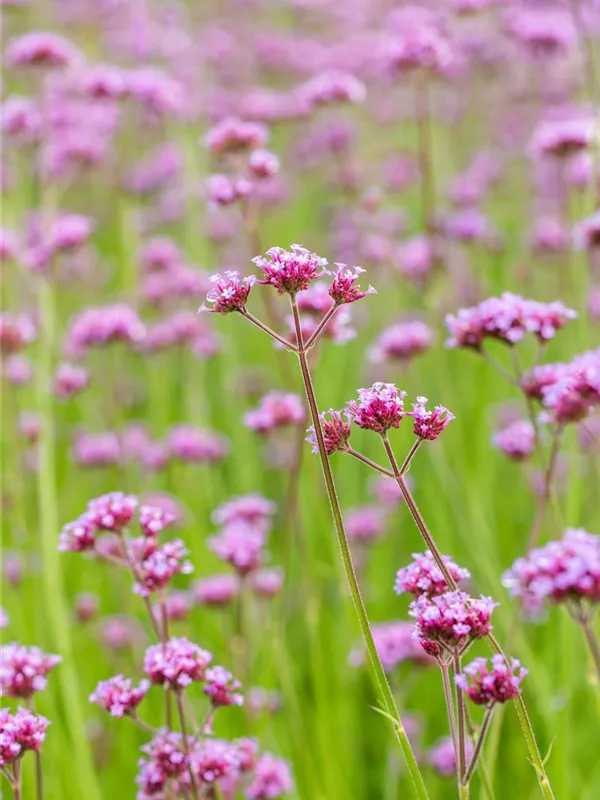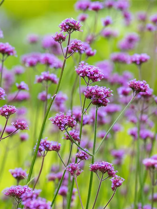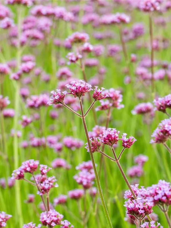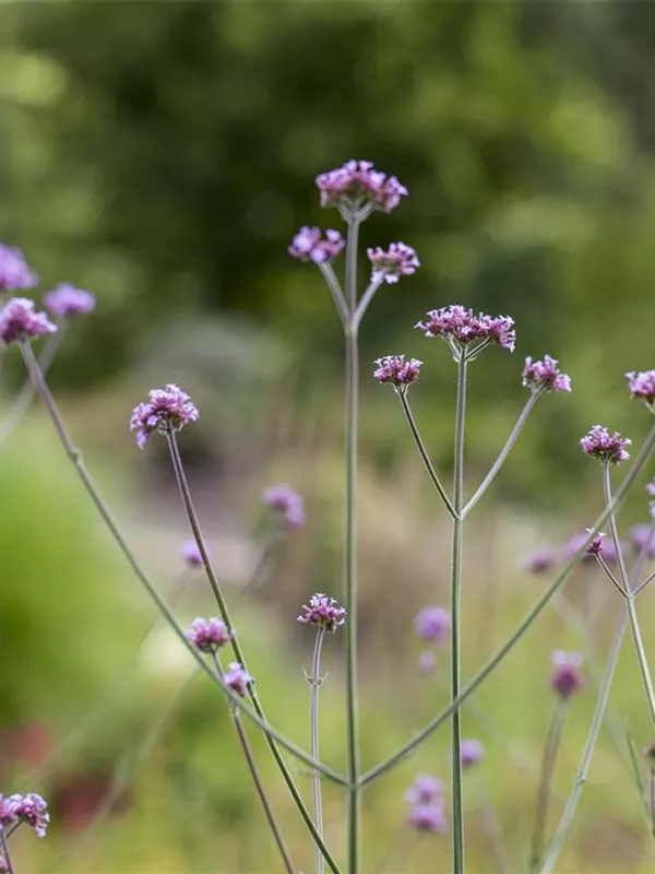Verbena bonariensis bildet in Dolden angeordnete, magentafarbene Blüten ab Juli.