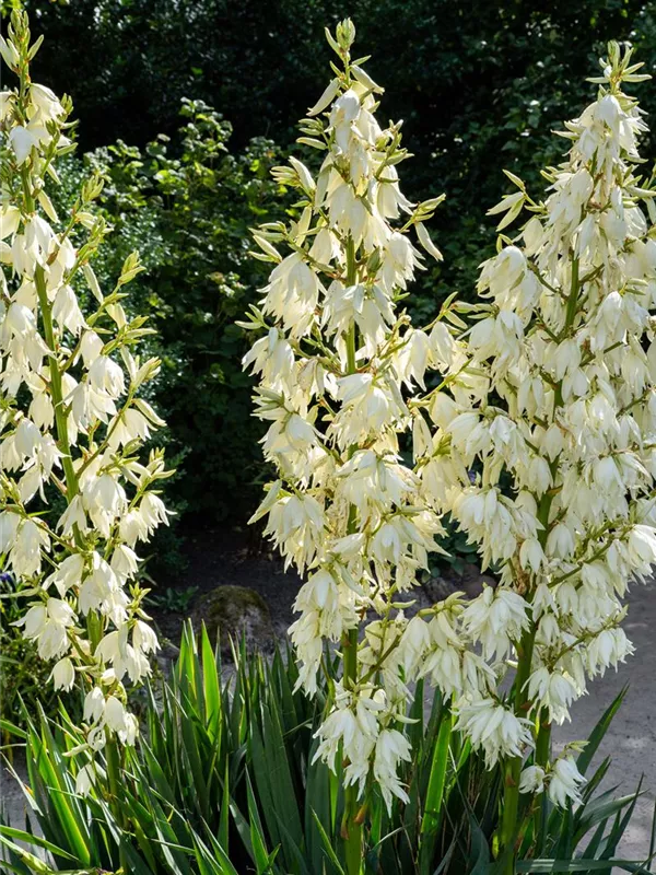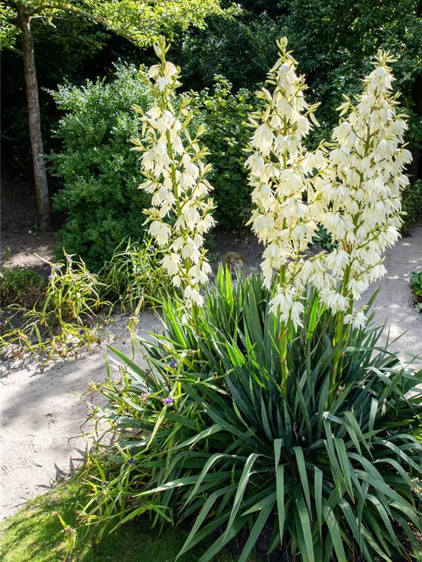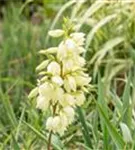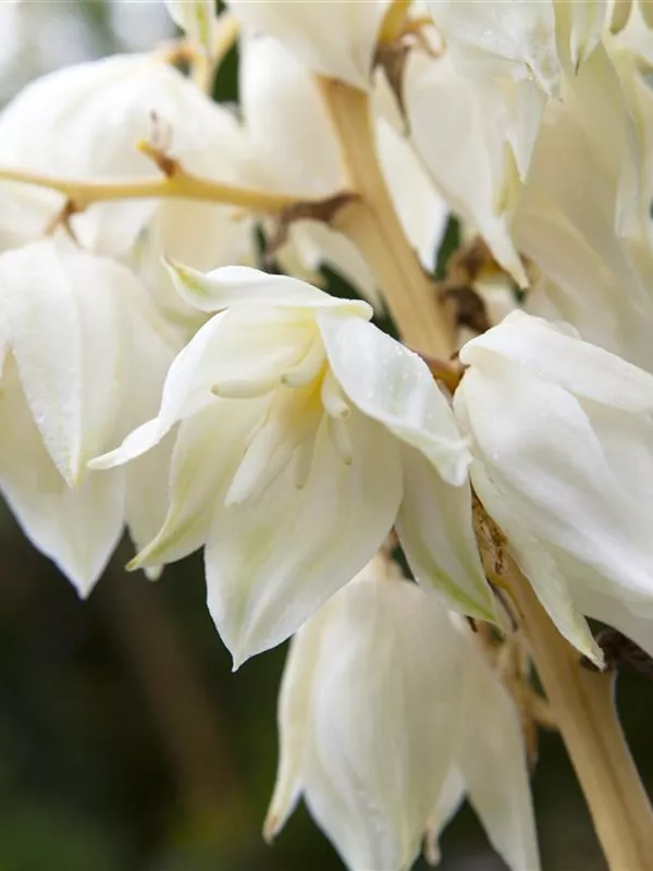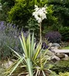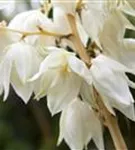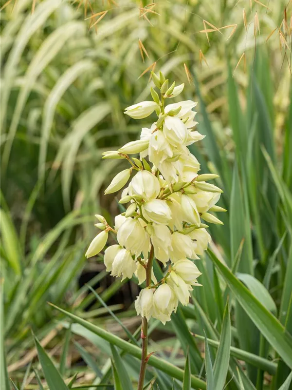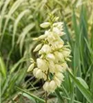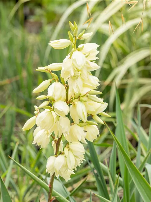 Yucca filamentosa bildet glockenförmige, in Rispen angeordnete, cremeweiße Blüten ab August.