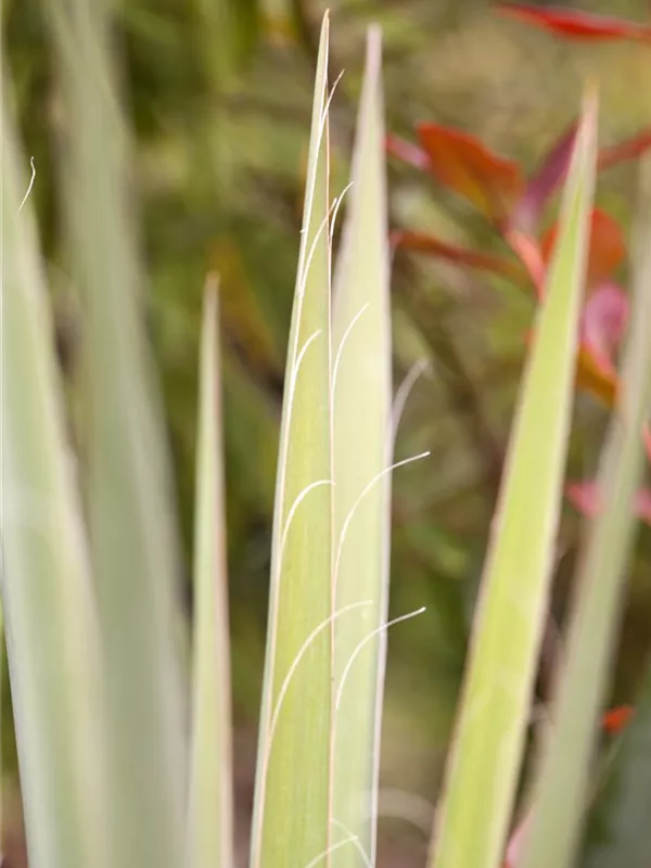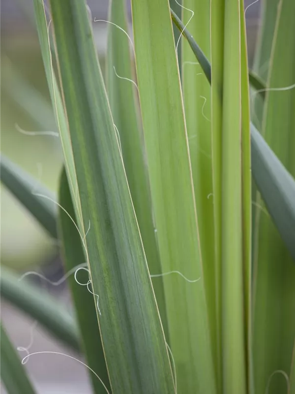 Hoher Blattschmuckwert. Die wintergrünen Blätter der Fädige Palmlilie sind grau-grün, lanzettlich.