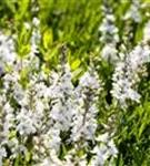 Veronica prostrata 'Alba' bildet rachenförmige, in Trauben angeordnete, weiße Blüten ab Mai.