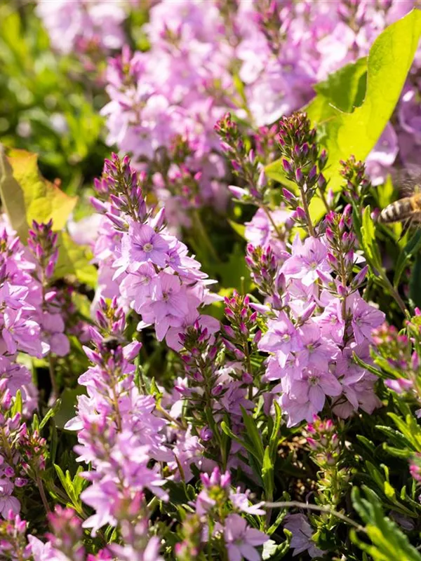 Veronica prostrata 'Rosea' bildet rachenförmige, in Trauben angeordnete, rosafarbene Blüten ab Mai.