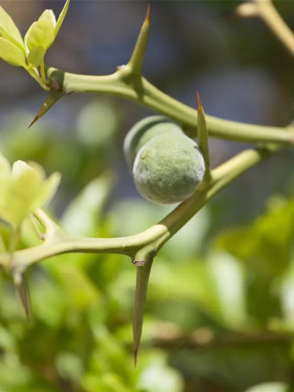 Die Triebe von Poncirus trifoliata sind bedornt, grün.