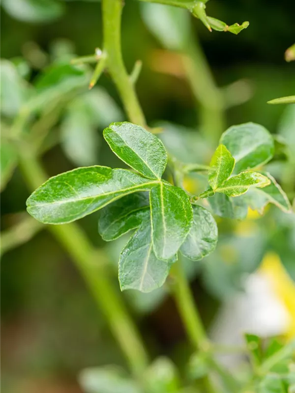 Die sommergrünen Blätter der Bitterorange sind dunkelgrün, eiförmig, gesägt. Bitterorange zeigt sich leuchtend gelb-orange im Herbst.