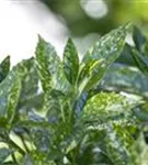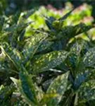 Die immergrünen Blätter der Japanische Aucube 'Crotonifolia' sind gelb-grün, panaschiert, lanzettlich.