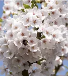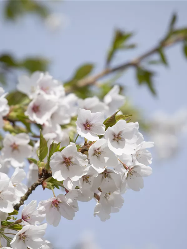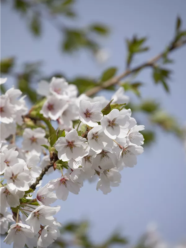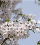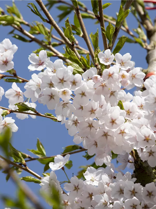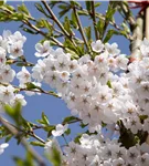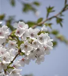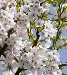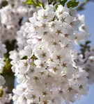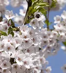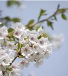 Die weißen Blüten der Japanischen Maienkirsche erscheinen in Trauben von Ende März bis April. Diese werden etwa 3 - 4 cm groß und sind leicht duftend.