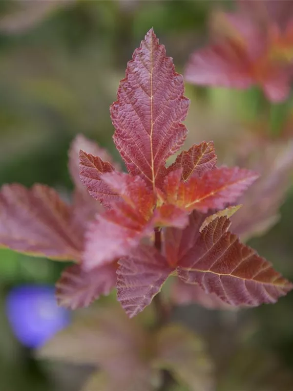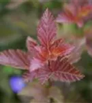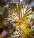 Hoher Blattschmuckwert. Die sommergrünen Blätter der Fasanenspiere 'Lady in Red'® sind dunkelrot, eiförmig, wechselständig, gelappt. Diese sind etwa 5 - 10 cm groß.
