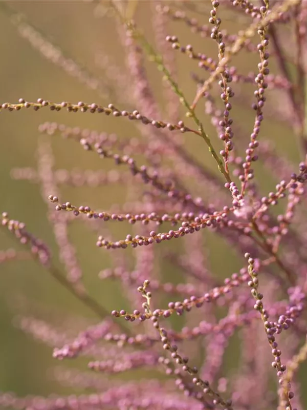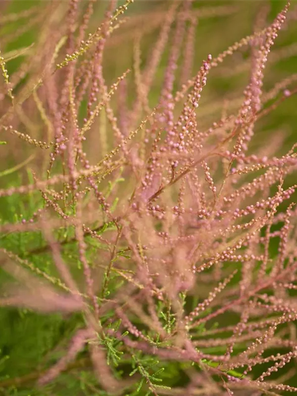 Die hellrosafarbenen Blüten der Kaspische Tamariske'Pink Cascade' erscheinen in Rispen von Juli bis September.