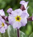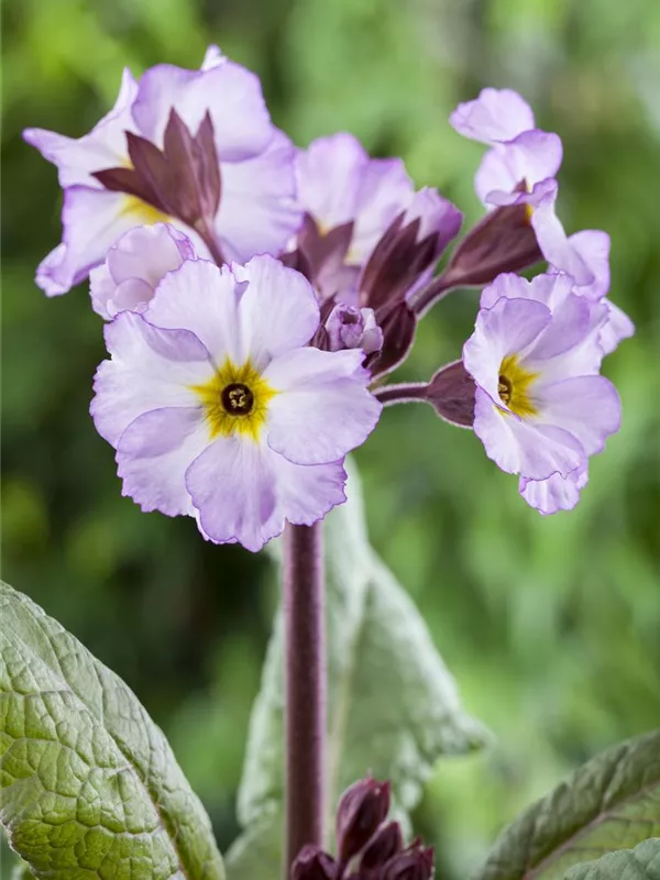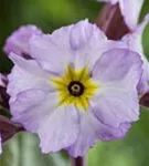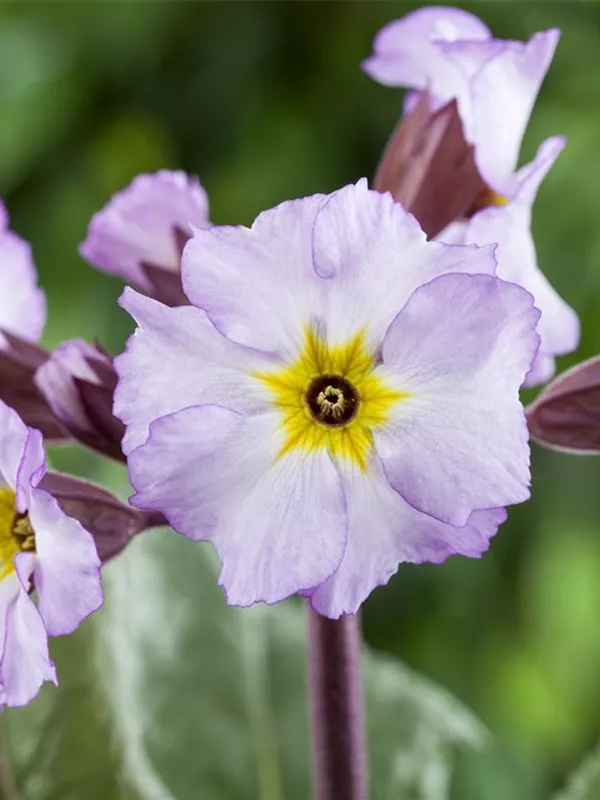 Primula x pruhoniciana bildet schalenförmige, violette Blüten ab März.