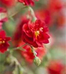 Helianthemum 'Rubin' bildet gefüllte, schalenförmige, blutrote Blüten ab Mai.