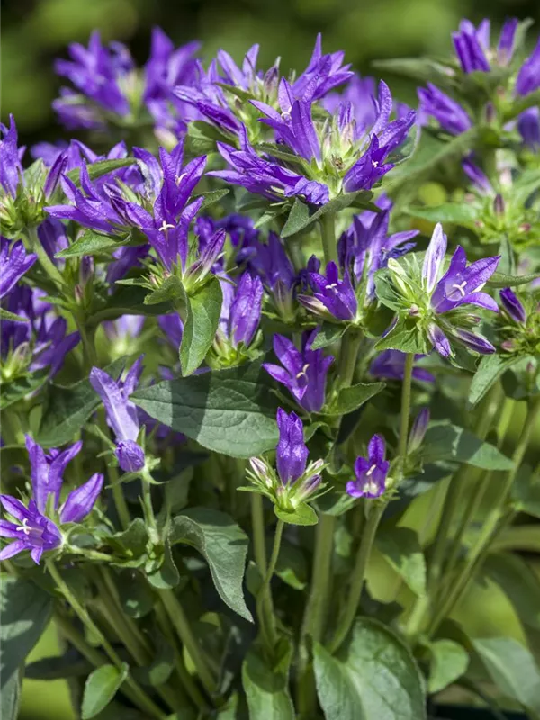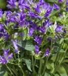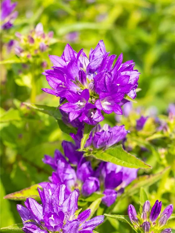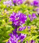 Campanula glomerata 'Acaulis' bildet glockenförmige, in Quirle angeordnete, violette Blüten ab Juni.