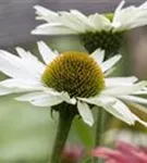 Zum Verzehr geeignet. Echinacea purpurea 'Virgin' bildet körbchenartige, gefranste, weiße Blüten ab Juli.