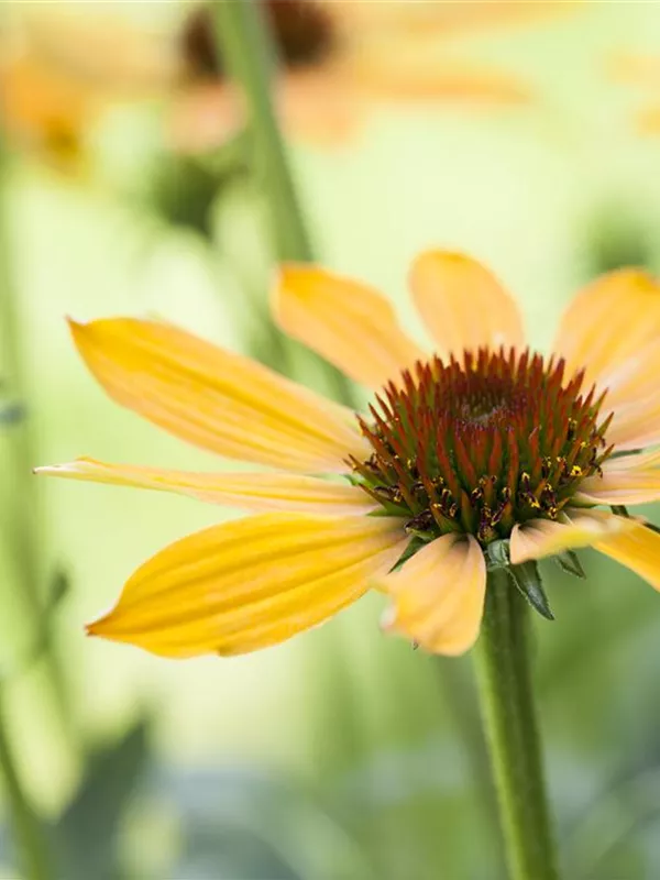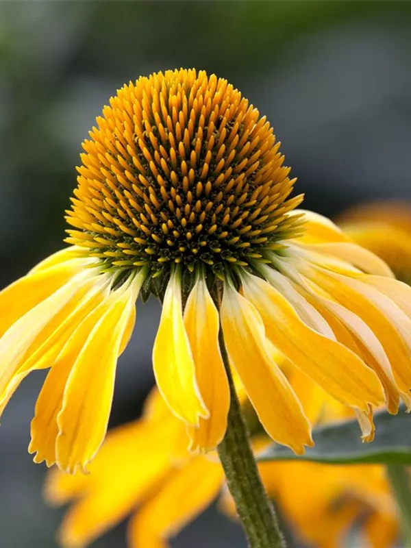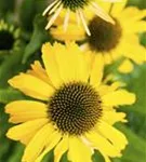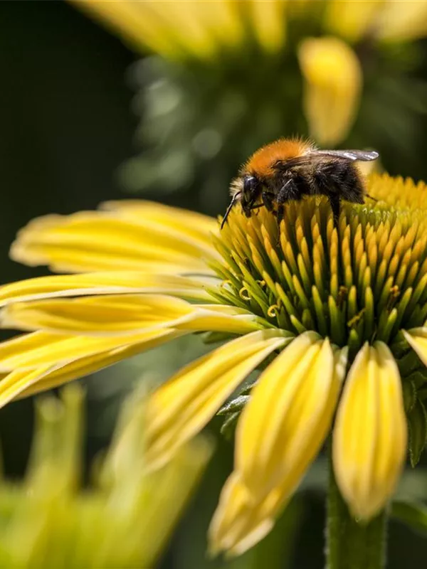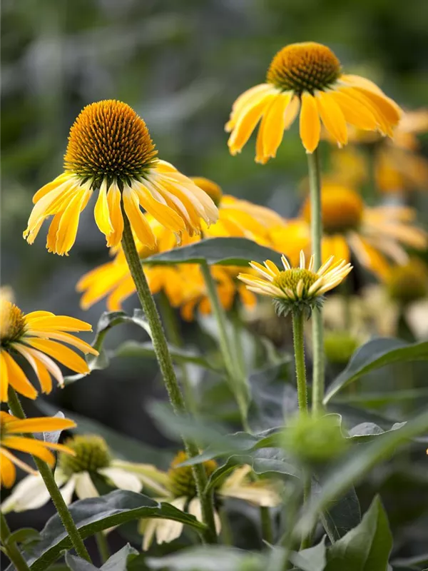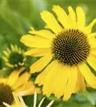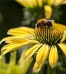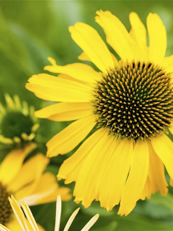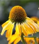 Zum Verzehr geeignet. Echinacea purpurea, gelb bildet körbchenartige, gelbe Blüten ab Juli.