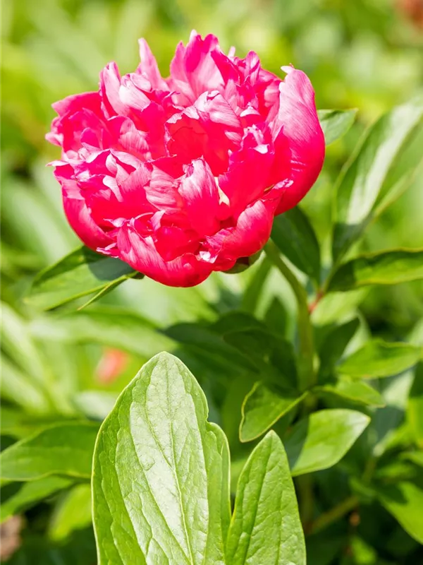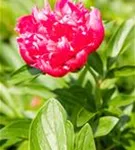 Die Blätter der Bauerngarten-Pfingstrose 'Rosea Plena' sind dunkelgrün, gefingert.
