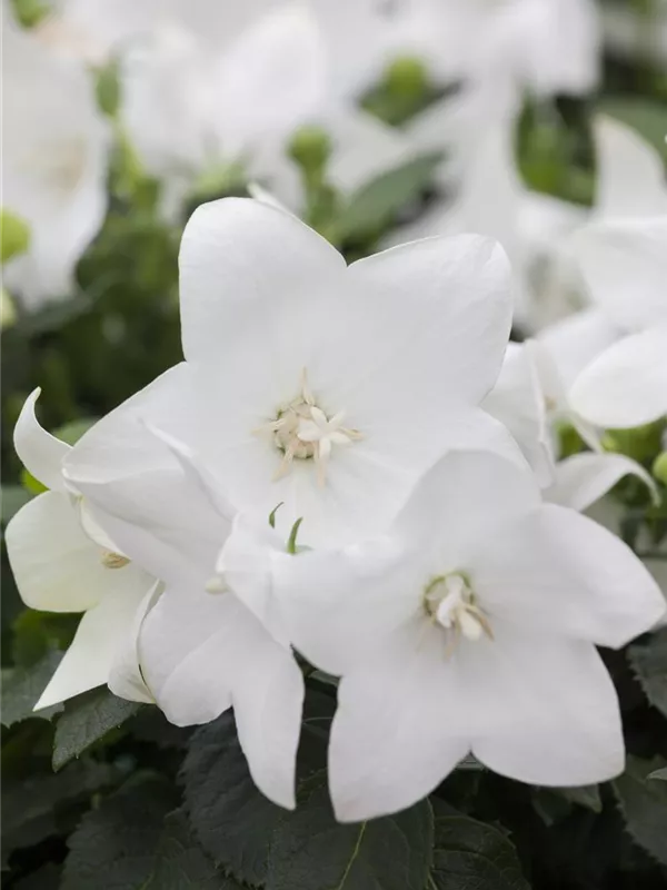 Platycodon grandiflorus, weiß bildet glockenförmige, weiße Blüten ab Juli.