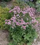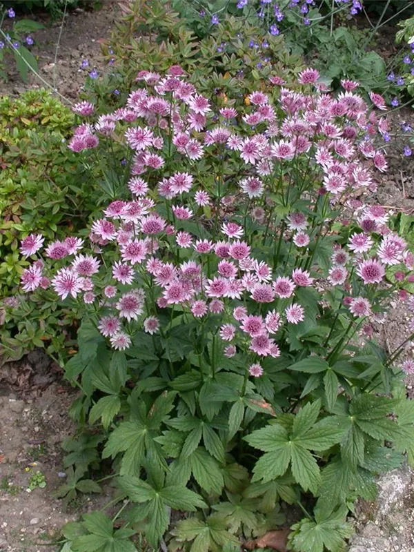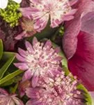Astrantia major bildet sternförmige, in Dolden angeordnete, rosa-weiße Blüten ab Juni.