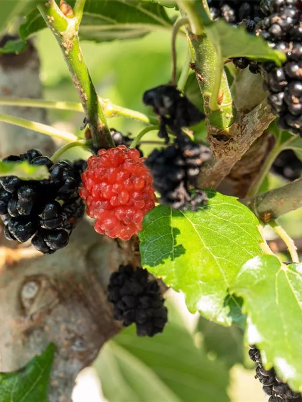 Morus rotundiloba BobBonBerry® 'MojoBerry' bildet schwarze, beerenartige Früchte.