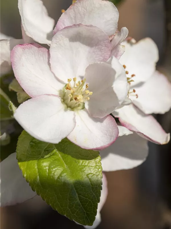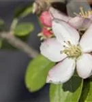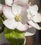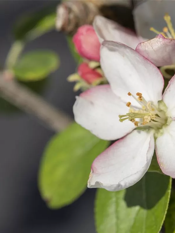 Malus domestica 'Goldparmäne' bildet hellrosafarbene Blüten ab April.