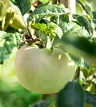 Malus domestica 'Ontario' bildet gelb-grüne, flache Früchte.