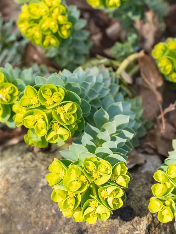 Euphorbia myrsinites bildet grüngelbe Blüten ab Mai.