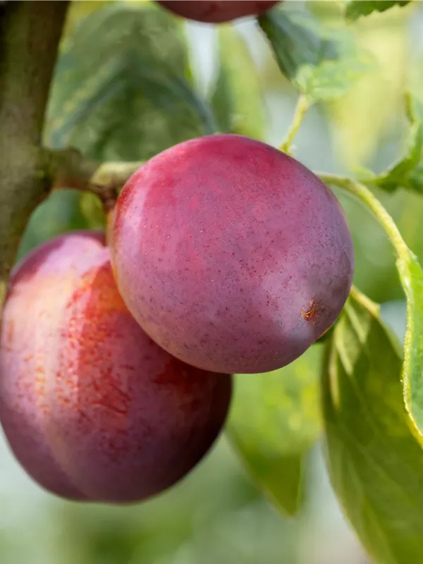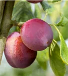 Prunus domestica 'Königin Viktoria' bildet rote Früchte.