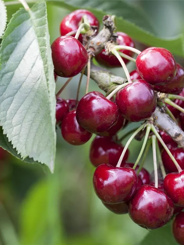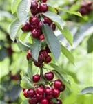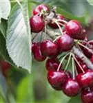 Prunus avium 'Skeena' bildet rote, glänzende Früchte.
