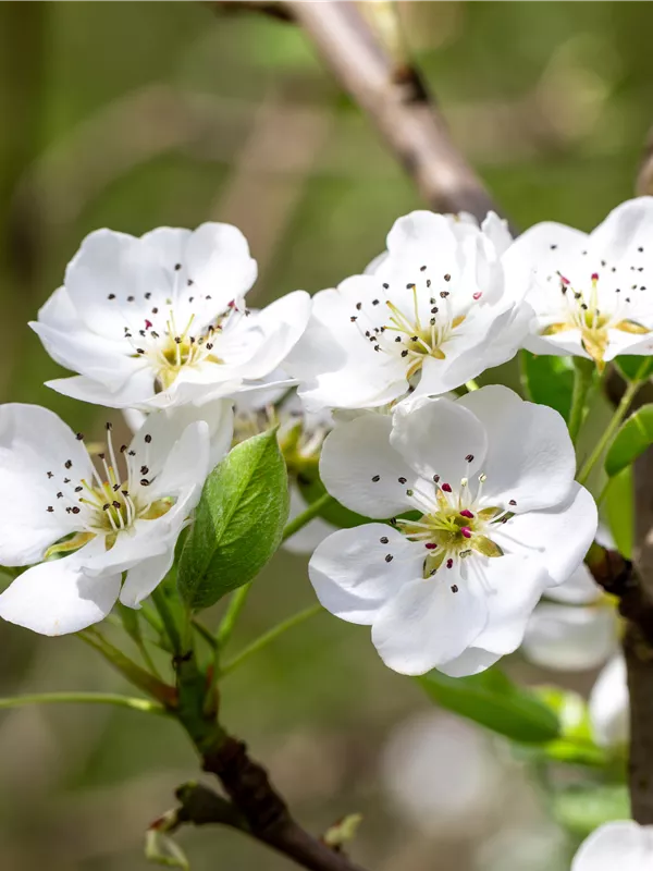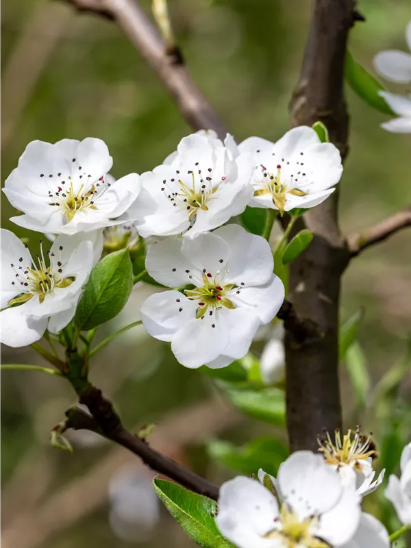 Pyrus communis 'Clapps Liebling' bildet in Doldentrauben angeordnete, weiße Blüten ab April.