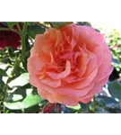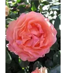 Die apricot-orangefarbenen, gefüllten, schalenförmigen Blüten der Beetrose 'Coral Lions' erscheinen in Dolden von Juni bis September. Diese sind leicht duftend.