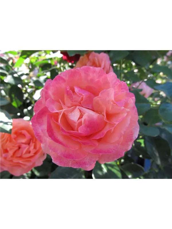 Beetrose 'Coral Lions' ist ein buschig und aufrecht wachsender Kleinstrauch, der eine Höhe von 60 - 80 cm und eine Breite von 40 - 50 cm erreichen kann.