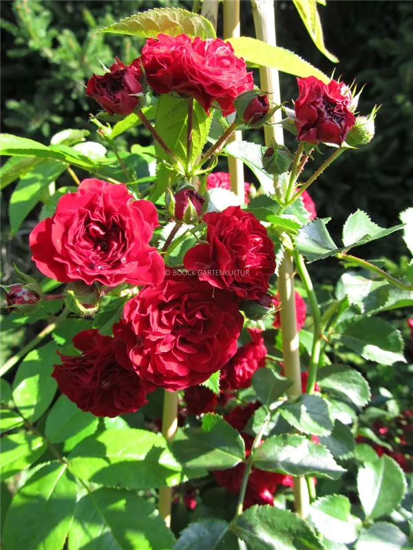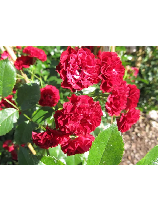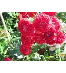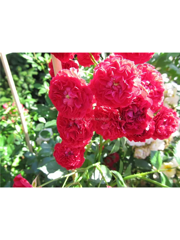 Die karminroten, schalenförmigen Blüten sind gefüllt und erscheinen von Juni bis Oktober. Diese sind angenehm duftend.
