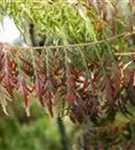 Hoher Blattschmuckwert. Die sommergrünen Blätter des Hirschkolben-Sumachs 'Tiger Eyes'® sind grüngelb, gefiedert, glänzend, wechselständig. Diese sind etwa 40 - 50 cm groß. Hirschkolben-Sumach 'Tiger Eyes'® zeigt sich leuchtend rot bis scharlachrot im Herbst.