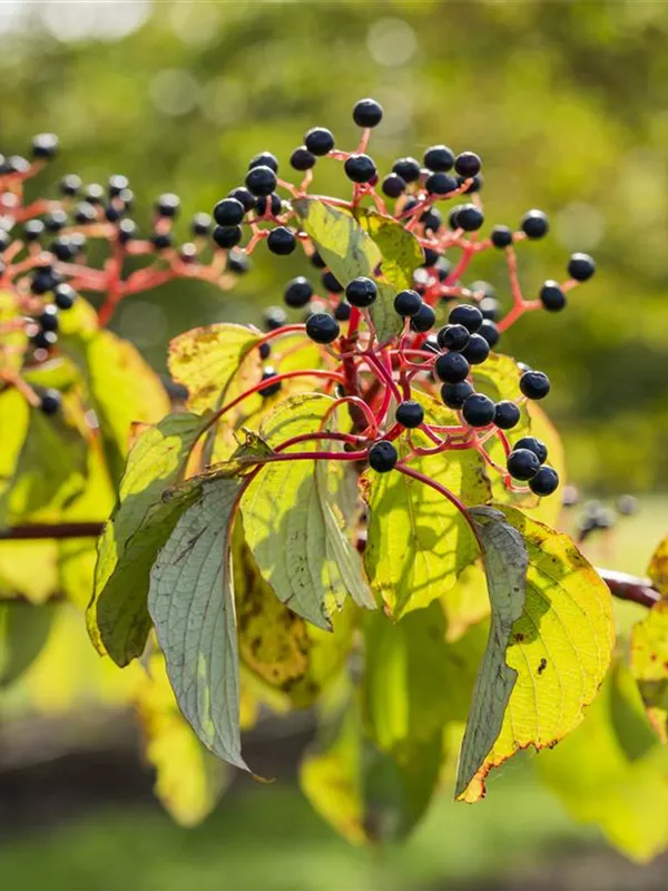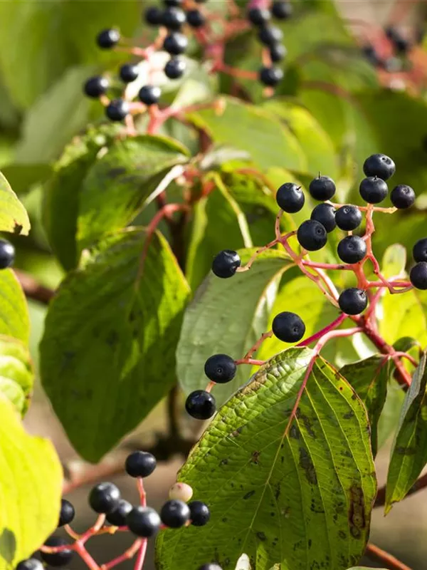 Besonders dekorativ sind die schwarzen, runden Steinfrüchte von Cornus sanguinea. Diese erscheinen ab September.