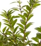 Die immergrünen Blätter der Heckenmyrte 'Elegant' sind mittelgrün, eiförmig, gegenständig. Diese sind etwa 1 - 2 cm groß.