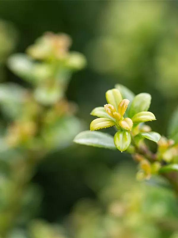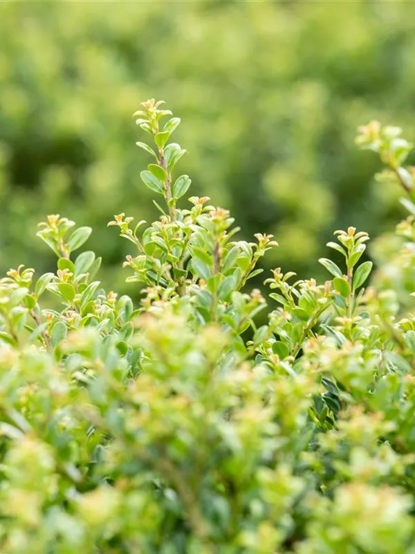 Die immergrünen Blätter des Berg-Ilexes 'Glorie Dwarf' sind mittelgrün. Diese sind etwa 2 - 3 cm groß.