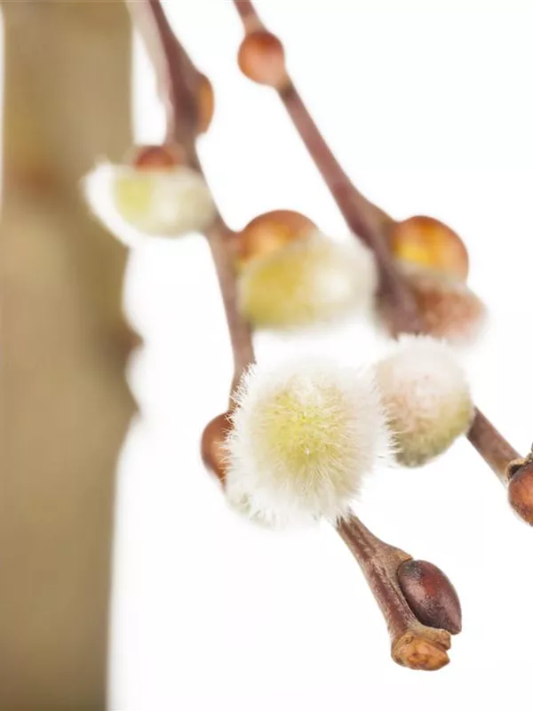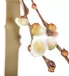 Salix caprea 'Curly Locks' bringt von März bis April gelbe, silbrige Blüten hervor. Diese verströmen einen angenehmen Duft.