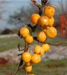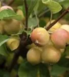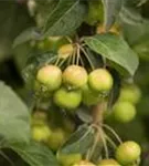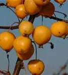 Besonders dekorativ sind die orangefarbenen, runden Früchte von Malus x zumi 'Golden Hornet'. Diese erscheinen ab September und sind klein.