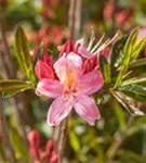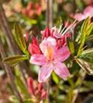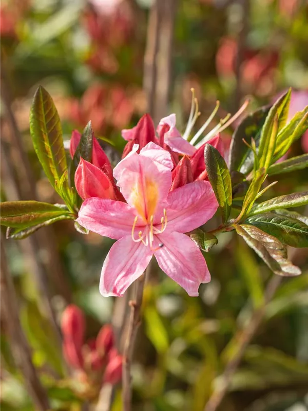 Rhododendron viscosum 'Juniduft' bildet von Ende Mai bis Mitte Juni zahlreiche trichterförmige, rosafarbene Blüten. Diese verströmen einen leichten Duft.