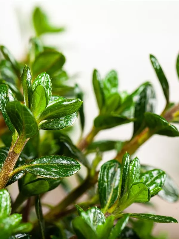 Die Japanische Azalee 'Anouk' ist wintergrün und trägt dunkelgrüne, glänzende, lanzettliche, eiförmige Blätter.