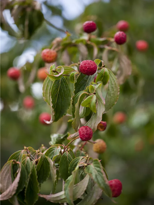 Besonders dekorativ sind die rosaroten Beeren von Cornus kousa chinensis 'Barmstedt'. Diese erscheinen ab September.