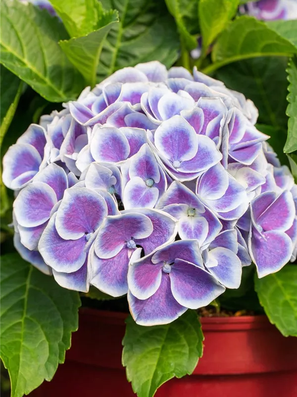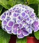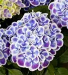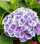 Die blau-weißen, schalenförmigen Blüten der Gartenhortensie 'Tivoli Blue' erscheinen in Dolden von Juni bis September.
