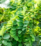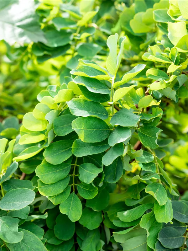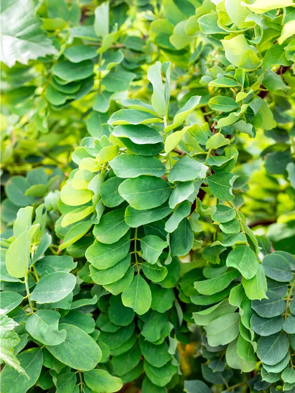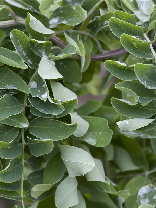 Die sommergrünen Blätter der Scheinakazie 'Twisty Baby'® sind dunkelgrün. Scheinakazie 'Twisty Baby'® zeigt sich leuchtend gelb im Herbst.