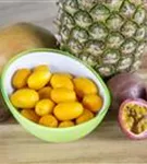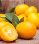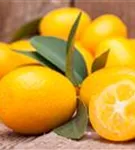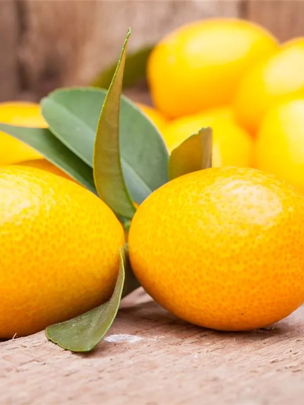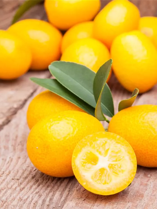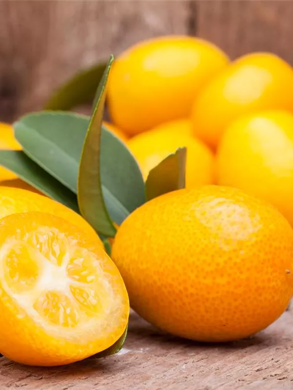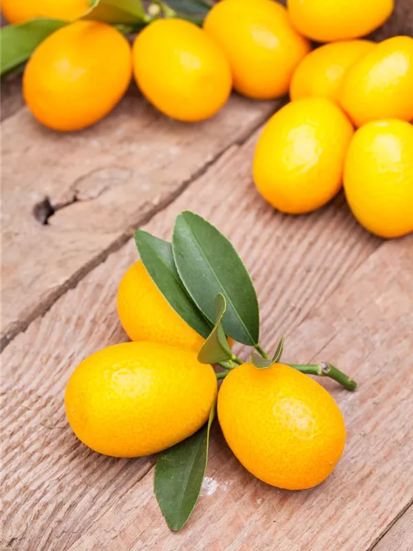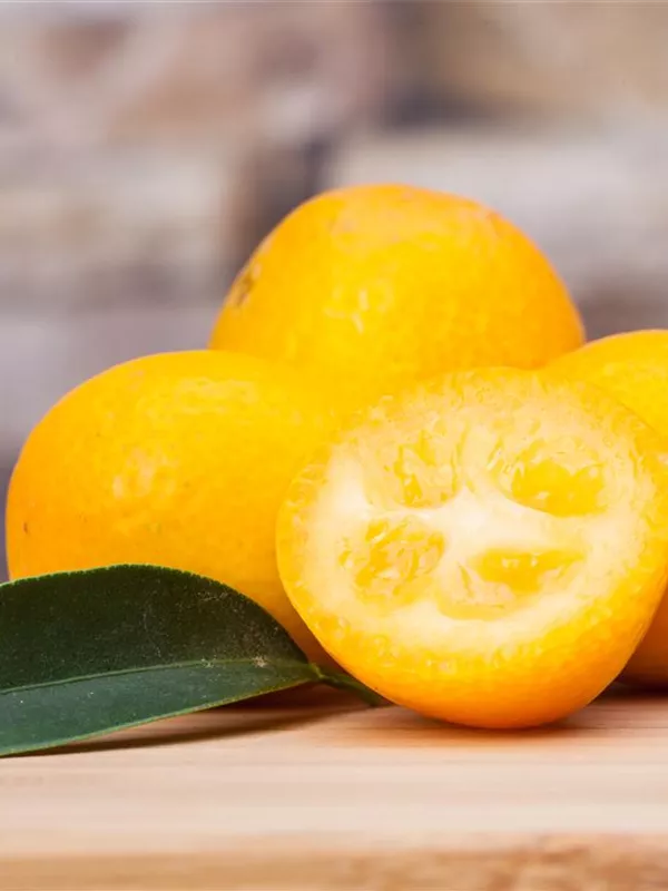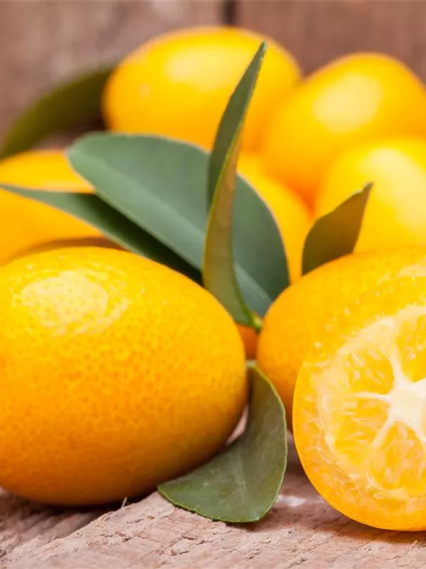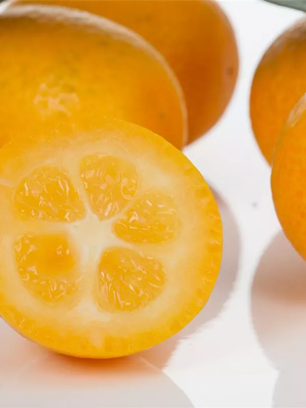 Besonders dekorativ sind die orangefarbenen Früchte von Citrus japonica. Diese erscheinen ab Dezember.