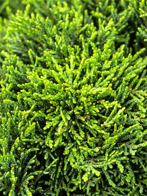 Scheinzypresse 'Green Globe' ist ein flach und rundlich wachsender Zwergstrauch. Sie erreicht gewöhnlich eine Höhe von 30 - 50 cm und wird ca. 30 - 50 cm breit. Langsam wachsend.