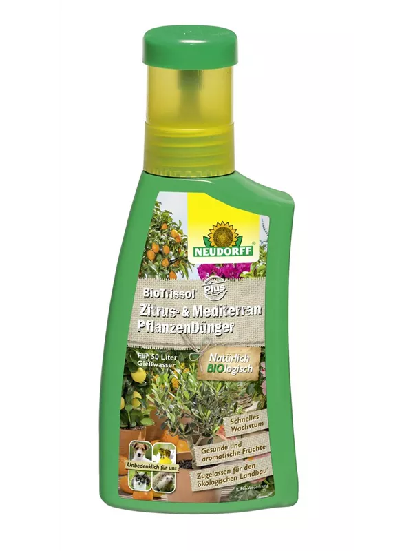 Organisch-mineralischer NPK-Dünger 4-1,5-4 mit Eisen, flüssig, unter Verwendung von pflanzlichen Stoffen, tierischen Nebenprodukten und Düngemittel. Die BIOlogische Vollwertkost für alle Zitrus- und Mediterranpflanzen. Das PLUS an BIOlogischen Stoffe sorgt für schmackhafte Früchte, beschleunigtes Pflanzenwachstum und erhöhte Widerstandskraft gegen Krankheiten und Schädlinge. Liefert viel natürliches Eisen für tiefgrüne Pflanzen und reiche Ernte.