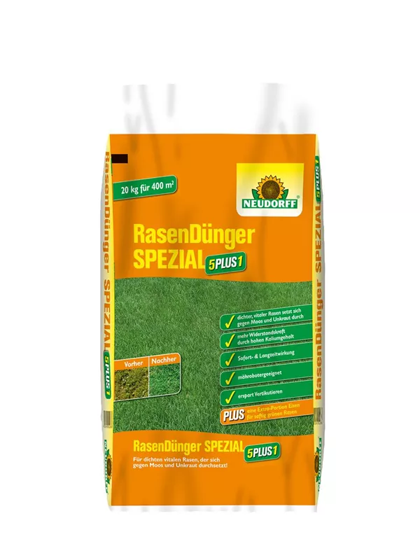 Rasendünger Spezial 5+1 ist ein organisch-mineralischer Dünger für dichten und vitalen Rasen, der sich gegen Moos und Unkraut durchsetzt. Die Allzweckhilfe mit Sofort- und Langzeitwirkung sorgt für eine höhere Widerstandskraft der Rasenfläche. Für einen intensiv grünen Rasen sorgt eine besondere Eisenverbindung. Rasendünger Spezial 5+1 ist für Mähroboter geeignet und erspart das Vertikutieren.